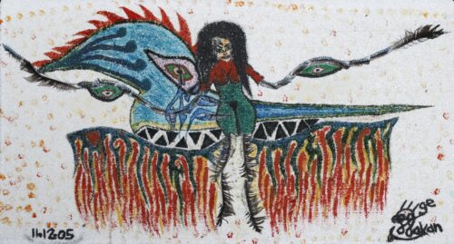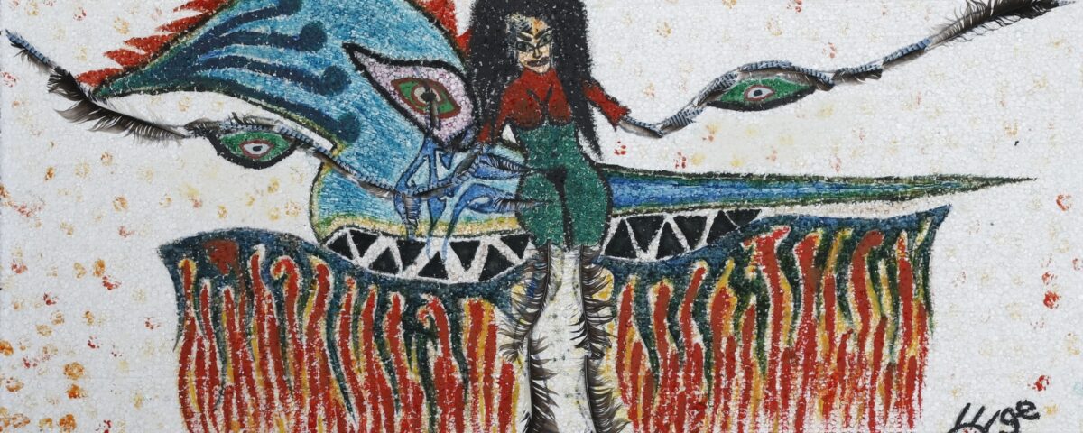 Gerçek bir kuşun kanatlarından alınmış mavi tüyler bulunan bu resimde, Orman yangınından etkilenen cansız bir kuşun büyüsü anlatılmaktadır. Dünyadan ayrılan ruhunun geride bıraktığı üzüntü ve gözlerinden yansıyan parıltı ormanı büyülemiştir. Sevimli küçük kuşun bedeni orman meleği tarafından ateşe karşı korumaya alınmıştır...